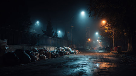 A moody urban night scene featuring streetlights illuminating piles of garbage. Deep shadows and reflections create a dramatic atmosphere, captured in high fidelity.