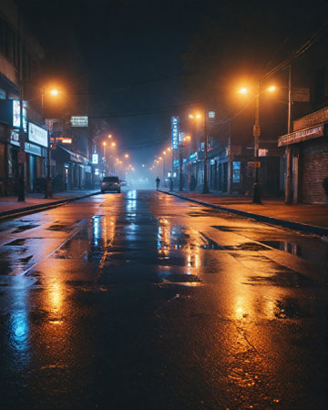Nocturnal City: Illuminated Shopfronts in Rainy Streets