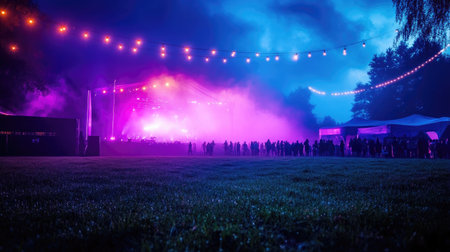 Vibrant festival scene showcasing a stage illuminated by colorful lights and fog, with a captivated crowd enjoying the lively performance under an enchanting night sky.