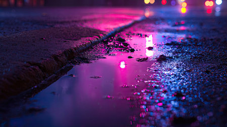 Close-up shot shows reflections of neon lights on wet pavement, featuring vibrant pink and blue hues. The image showcases the aftereffects of rain creating a reflective surface with a shallow depth of field. This visual can be utilized for design or conceptual purposes, suggesting atmosphere.