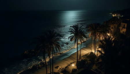 Tropical palm tree illuminates tranquil waterscape beauty generated by artificial intelligence