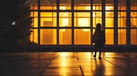 Small girl goes to preparatory school looking at illuminated windows in evening. Nervous preschooler walks to preparatory form for first time in back lit, copy space