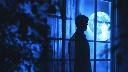 Silhouette of man standing by window with full moon outside in blue light, mysterious night scene. Contemplative solitude and introspection concept