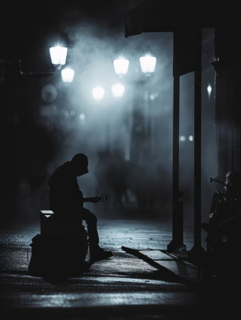 A lone person stands on a deserted street at night, illuminated by streetlights, creating a somber atmosphere perfect for adding text.