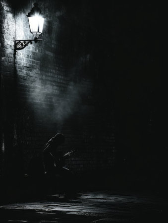 A solitary figure strolls through a dark alley under flickering streetlights evoking intrigue and solitude.