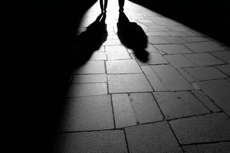Dark silhouette of a person casting a long shadow on a brick wall, creating a mysterious and suspenseful atmosphere
