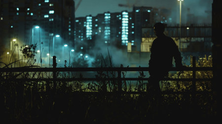 A lone figure leans against a rusted fence silhouette stark against the dimly lit set. In the distance a group of buildings .
