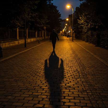 A lone person strolls along a deserted street under the soft glow of streetlights, casting long shadows on the pavement, surrounded by darkness.