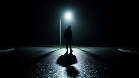 A lone person stands on an empty street at night, with streetlights casting dramatic shadows on the wet pavement. Dark space above invites text.