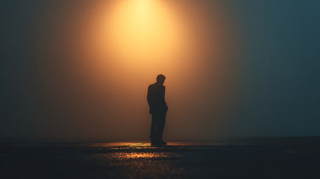 A solitary figure stands in a foggy setting, illuminated by warm and cool lights, capturing a sense of mystery and solitude in the night.