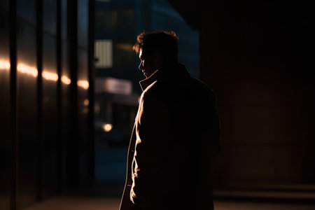 Dramatic silhouette of a man barely visible in the dark, evoking mystery, suspense, and cinematic atmosphere in low-key lighting.