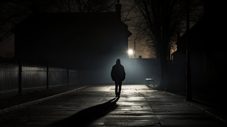 A ghostly figure emerges from the shadows on an empty street, creating a cinematic horror tone. The high contrast between light and dark enhances the eerie atmosphere in this night photography.