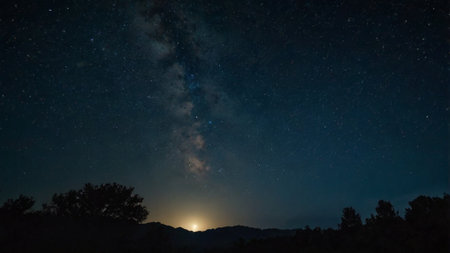 Breathtaking milky way and full moon casting magical light over majestic mountain landscape at night