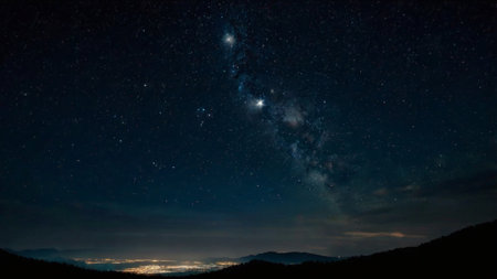 A view of a dark night sky showcasing numerous stars and the Milky Way galaxy, A starry night sky with the Milky Way stretching across it