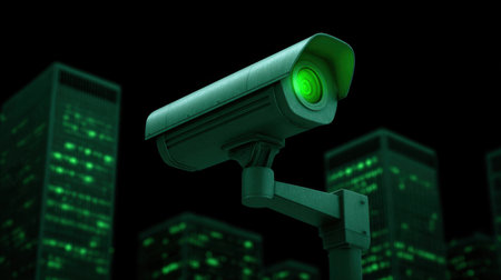 This image features a striking green surveillance camera set against a dark city skyline, showcasing the balance between technology and urban life.