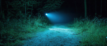 Spotlight illuminating forest path guides through mysterious and adventurous surroundings