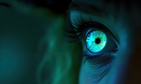 Intense close-up of a human eye reflecting neon blue light, conveying focus and mystery.