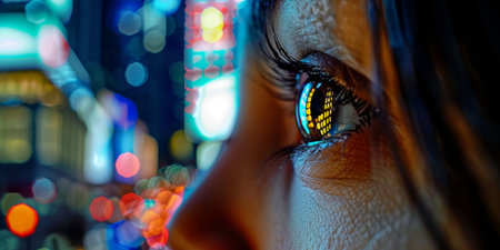 This captivating close-up captures an eye reflecting a stunning city skyline, illuminated by colorful lights during twilight, showcasing vibrant urban beauty.