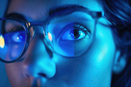 A woman wearing glasses is shown with a blue light illuminating her face, creating a striking and futuristic effect.