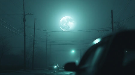 A tranquil road shrouded in thick fog is illuminated by a striking blue light beam, creating an atmospheric and mysterious setting ideal for dramatic visuals.