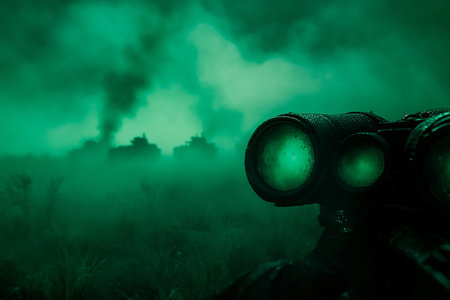 A gripping moment unfolds as night vision scopes reveal silhouettes of armored vehicles cloaked in green mist. The atmosphere is charged with a sense of urgency and anticipation.