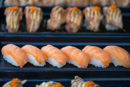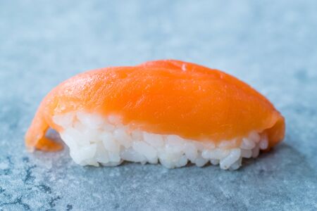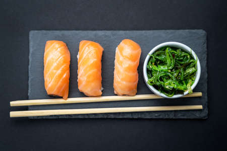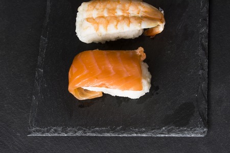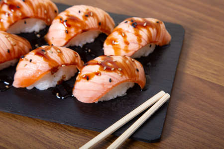 Salmon nigiri sushi, served on a black slate plate, selective focus