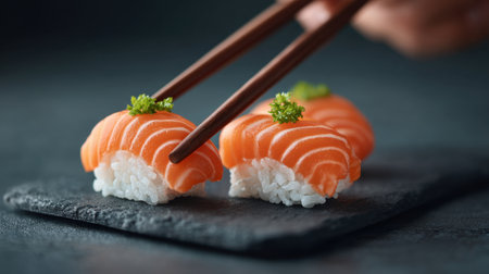 Close-up view of fresh salmon sushi being picked up by chopsticks, highlighting the intricate details of the dish and its presentation on a dark slate background.