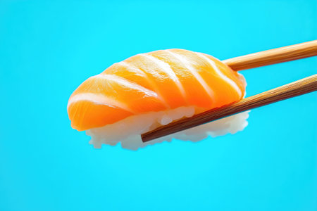 Traditional japanese nigiri sushi with salmon placed between chopsticks