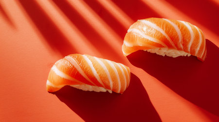 Delicious fresh salmon nigiri. Red pastel background. Asian cuisine. Aesthetic food concept. Generative AI.