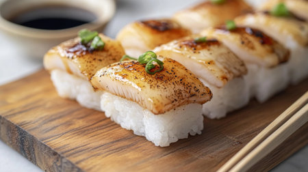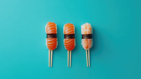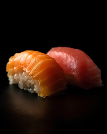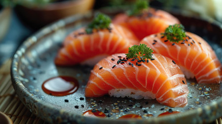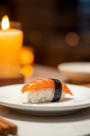 Savor the elegance of salmon nigiri sushi, illuminated by candlelight. Perfect for showcasing upscale dining, cuisine, and cultural experiences.