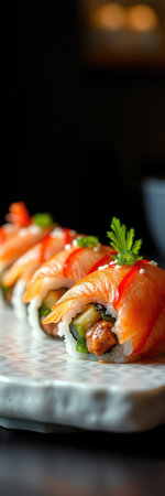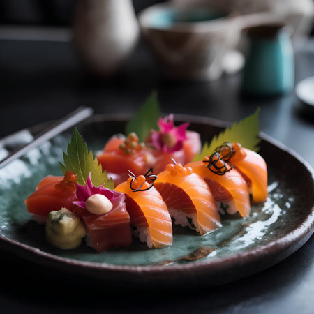 Close-up view of an enticing sushi platter featuring fresh fish varieties and decorative garnishes served in a stylish restaurant.