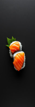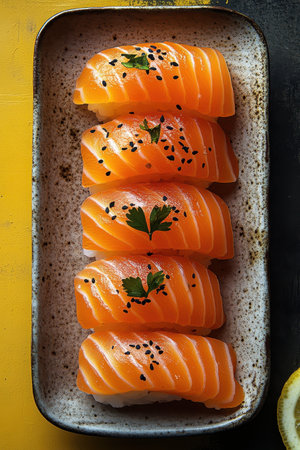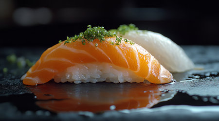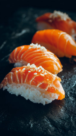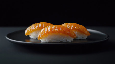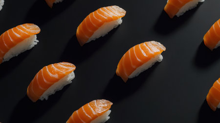 A modern presentation of salmon sushi, featuring bright orange fish slices atop rice, styled on a minimalist black surface.