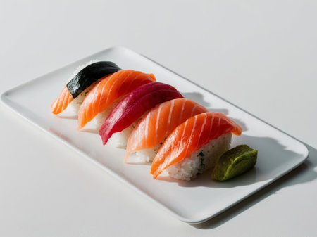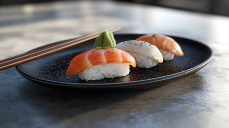 A stunning close-up of assorted nigiri sushi elegantly presented on a sleek plate. This image showcases vibrant colors and textures, perfect for culinary enthusiasts.