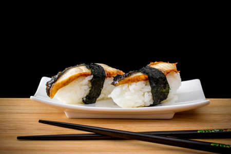 Two nigiri eel sushi with chopstick on bamboo board, black background
