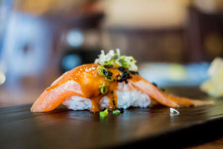 Salmon burned sushi with sauce and black caviar on top served on black plate. Selective focus