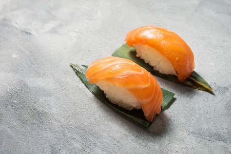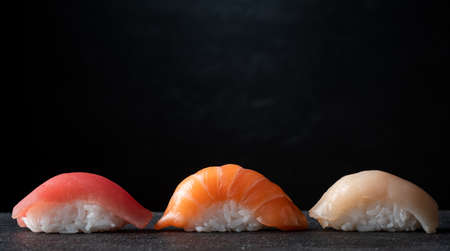 Delicious sushi nigiri of salmon on a dark wooden table. Copy space.