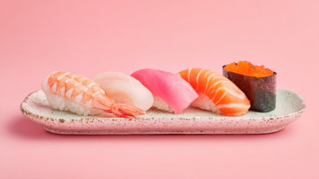 Sushi is displayed on a plate featuring a variety of seafood, including shrimp, salmon, and tuna. The colors are vibrant against the pink background, showcasing Japan's culinary tradition.