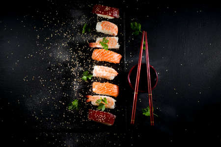 Traditional Japanese sushi top view with soy sauce and chopsticks on dark black minimal background. Sushi with salmon, tuna, shrimp, space for text