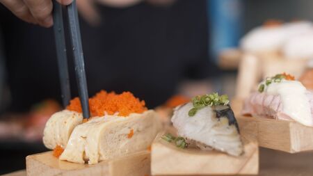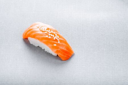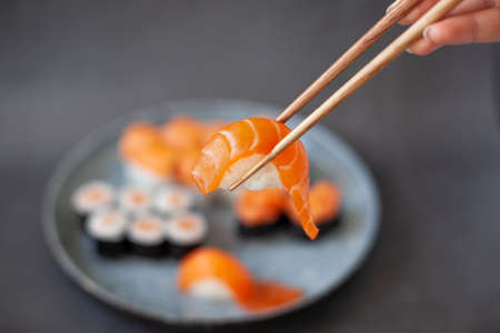 Eating sushi. Delicious Japanese cuisine, nigiri sushi with salm