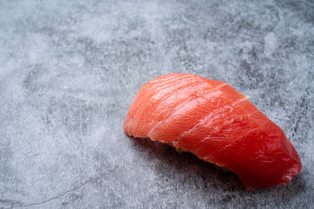Red tuna Nigiri with Nori seaweed and wasabi paste on black slate stone with chopsticks and bowl of soy sauce. Raw fish in traditional Japanese sushi style. Horizontal image.