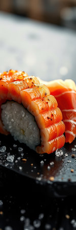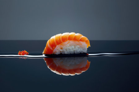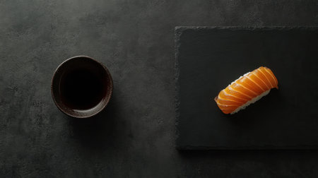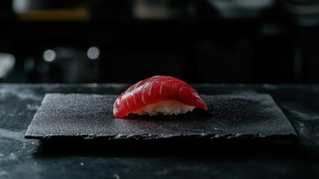 A minimalist setup showcasing a single piece of sushi on a dark plate. Perfect for food enthusiasts and culinary presentations, emphasizing simplicity and elegance.
