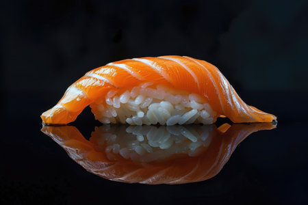 A single piece of salmon nigiri sushi sits on a black surface, with the reflection of the sushi visible.