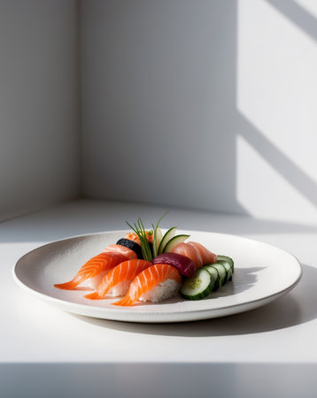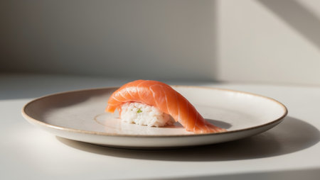 AI Generated. Vintage Style with Natural Lighting and Shadow Blurred Salmon Sushi on a White Plate