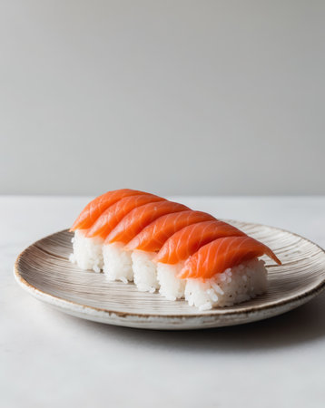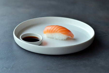Salmon nigiri elegantly arranged on a minimalist white plate, accompanied by soy sauce, inviting a delightful culinary experience