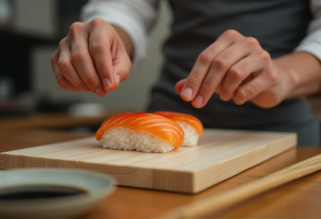 A chef carefully prepares a piece of sushi at a restaurant, placing it on a wooden board. The image highlights the skill, precision, and artistry involved in Japanese cuisine.