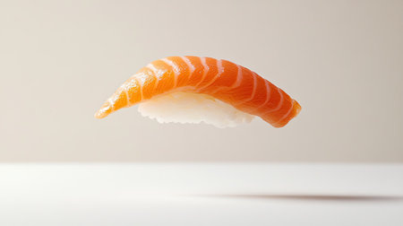 A piece of sushi nigiri levitates against a white background, emphasizing the precision and artistry of Japanese cuisine in a minimalist composition.