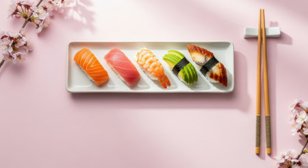 sushi, nigiri, japanese cuisine, food photography, seafood, salmon, tuna, shrimp, avocado, eel, chopsticks, chopstick rest, white plate, rectangular plate, cherry blossoms, pink background, asian food, traditional, gourmet, restaurant, delicious, healthy, diet, culinary, fresh, appetizer, raw fish, rice, nori, presentation, elegant, artistic, arrangement, still life, cuisine, culture, east asian, meal, dinner, lunch, gastronomy, delicacy, gourmet food, food styling, fine dining, top view, flat lay, studio shot