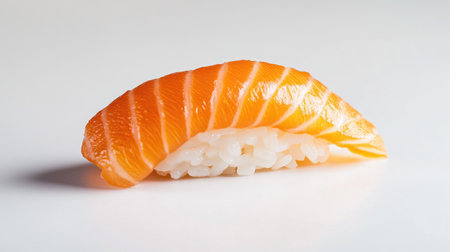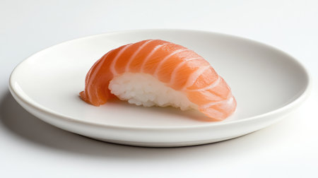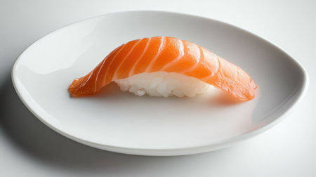 Enjoy a beautifully crafted piece of fresh salmon sushi on a pristine white plate, showcasing culinary art and vibrant colors for food enthusiasts.