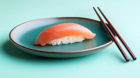 Single tuna nigiri on plate with chopsticks, mint background; food photography for restaurant menus. AI Generated