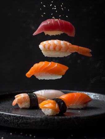 suspended sushi set, an elegant assortment of nigiri and sashimi pieces, hovering above a sleek black plate, studio lighting casting sharp shadows against an isolated background, emphasizing the raw beauty of the cuisine